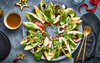 Roasted Sweet Potato and Beet Noodle Salad with Goat Cheese and Pistachio Vinaigrette
