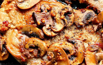Sautéed Pork and Mushrooms in a Skillet