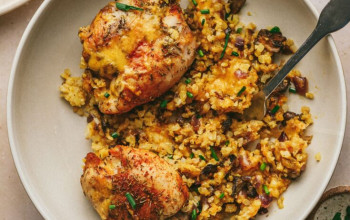 Savory Cauliflower Rice with Nuts and Sweet Bacon-Wrapped Chicken
