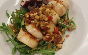Pan-Seared Scallops atop Arugula, Lentils, and Butter Beans