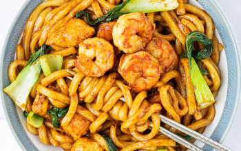 Stir-Fried Udon Noodles with Prawns and Vegetables