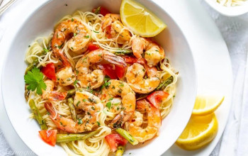 Shrimp Scampi Served with Tomatoes, Pasta, and Roasted Asparagus