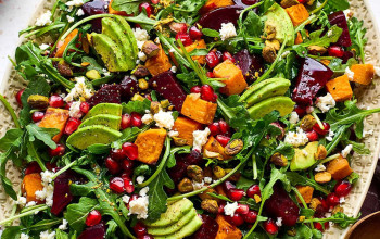 Roasted Sweet Potato and Beet Noodle Salad with Goat Cheese and Pistachio Vinaigrette